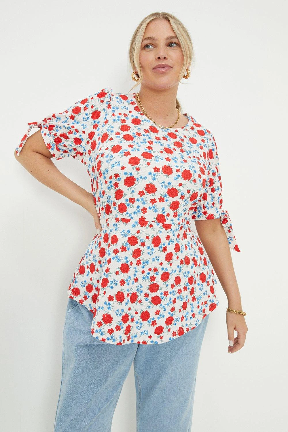 Dorothy Perkins Curve Red Ditsy Floral Tie Sleeve Blouse