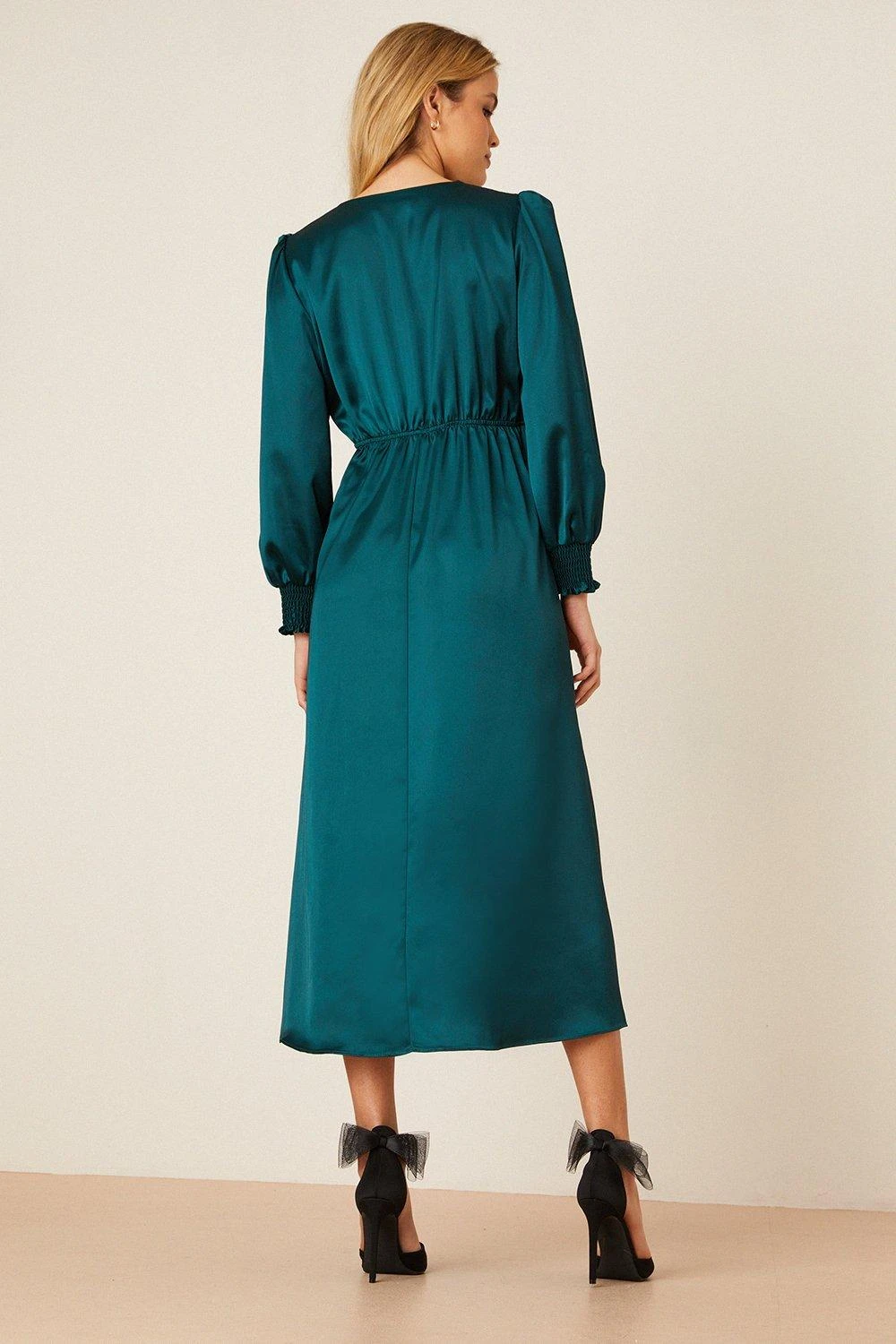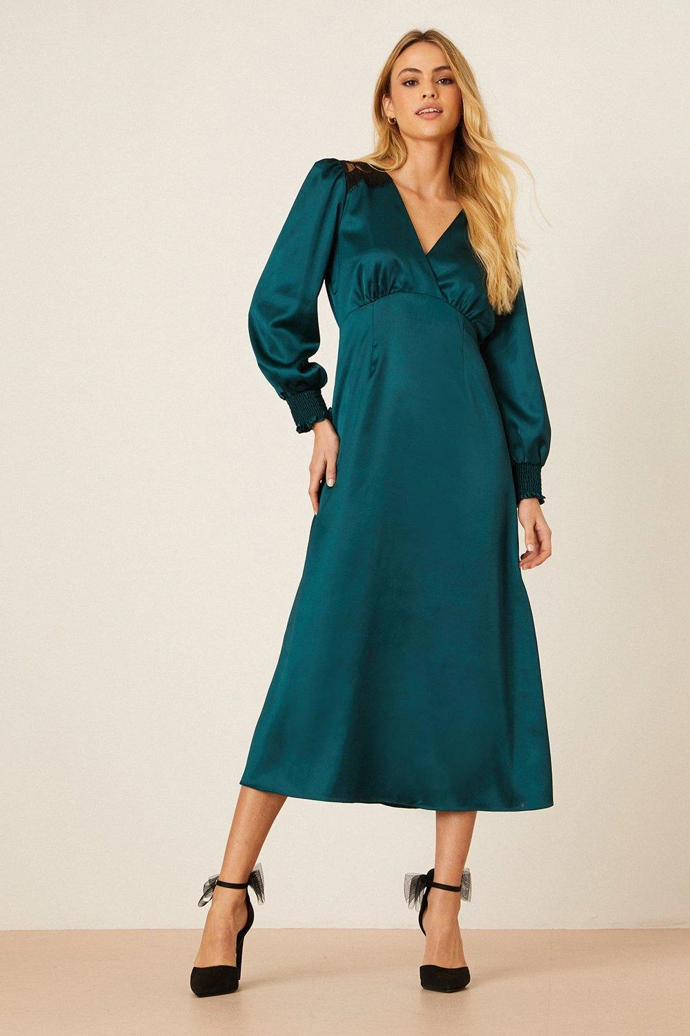 Dorothy Perkins Green Satin Lace Trim Wrap Midi Dress