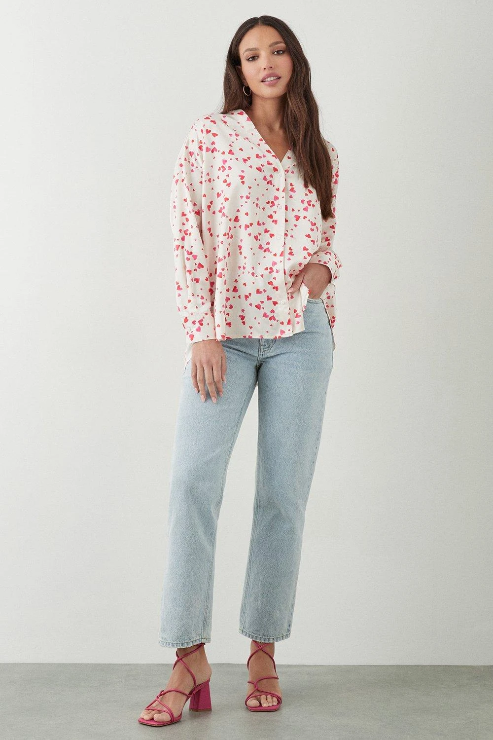 Update your wardrobe essentials with our collection of women’s shirts and blouses. From bright poplin shirts and floral prints to frilled statement styles, we’ve got everything you need to complete your look. Button up in an oversized fit or go super feminine in a cute lace blouse; wherever you’re going, we’ve got the shirt for you.Style: Heart Collarless Shirt Ideal for: Daywear Design: Buttons Model wears size UK 10 and is 5′ 9″ tall Make-up & Fragrance: Primer (Estée Lauder, Futurist Aqua Brilliance Watery Glow Primer), Foundation (Estée Lauder, Futurist Hydra Rescue Moisturizing Foundation SPF45), Bronzer (Benefit Hoola Matte Powder Bronzer), Mascara (Benefit, They’Re Real Lengthening Mascara Jet Black 8.5g), Setting Spray (Urban Decay, All Nighter Setting Spray 118ml), Fragrance (Jimmy Choo Eau De Parfum Signature).