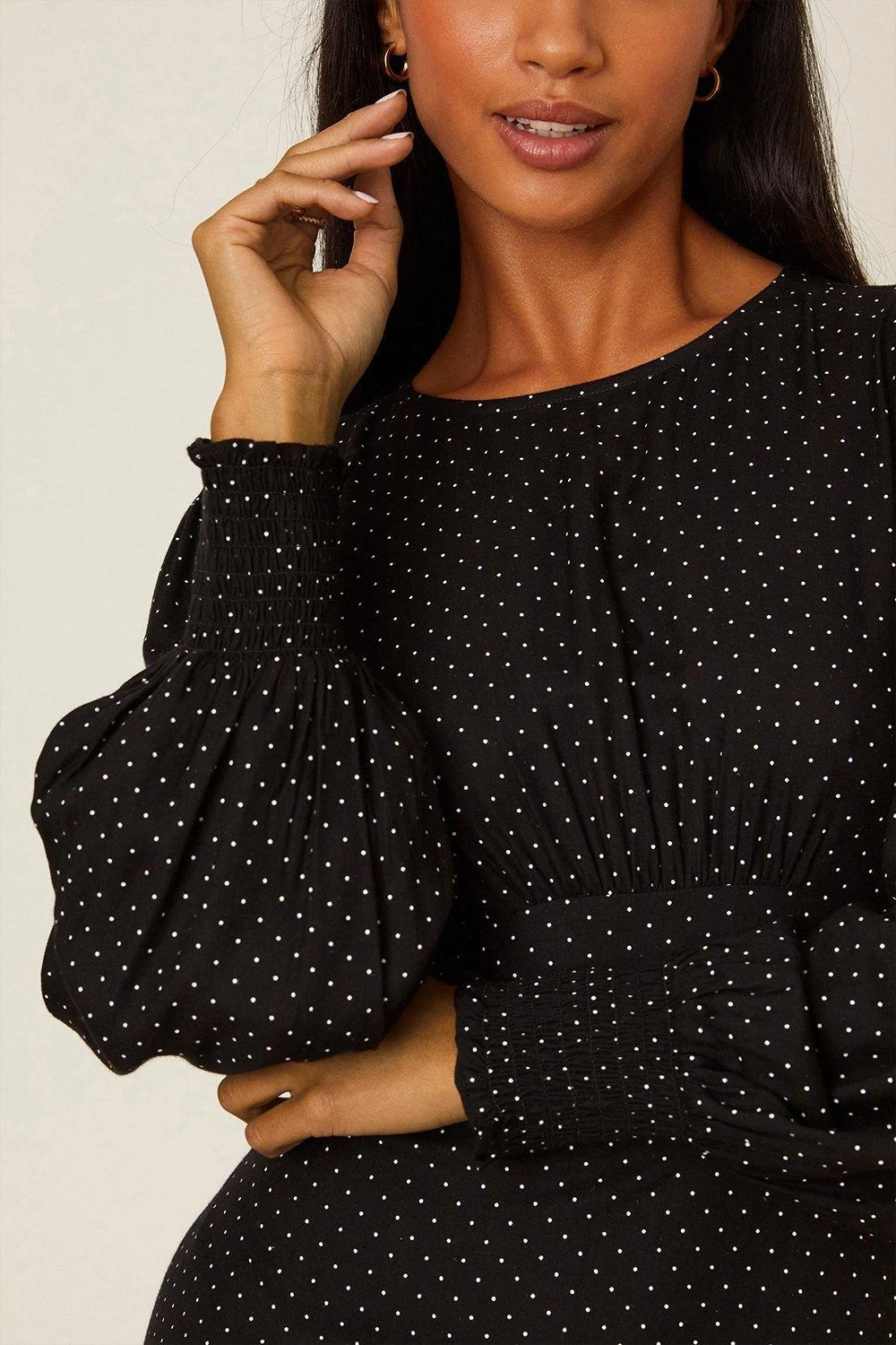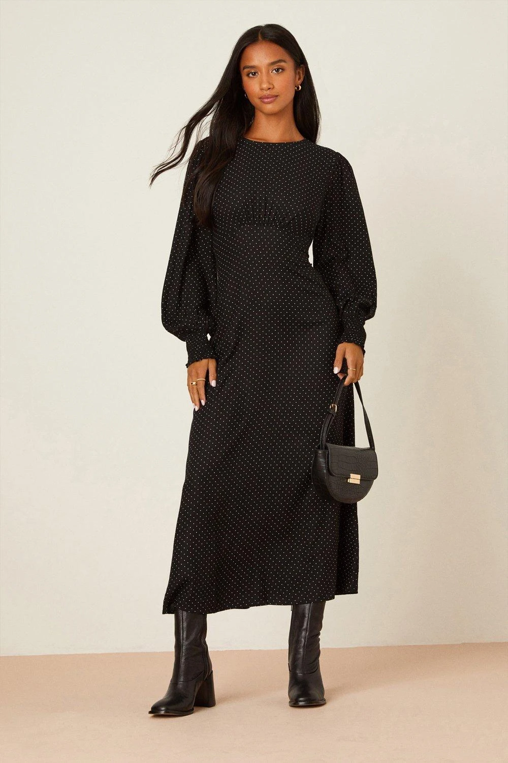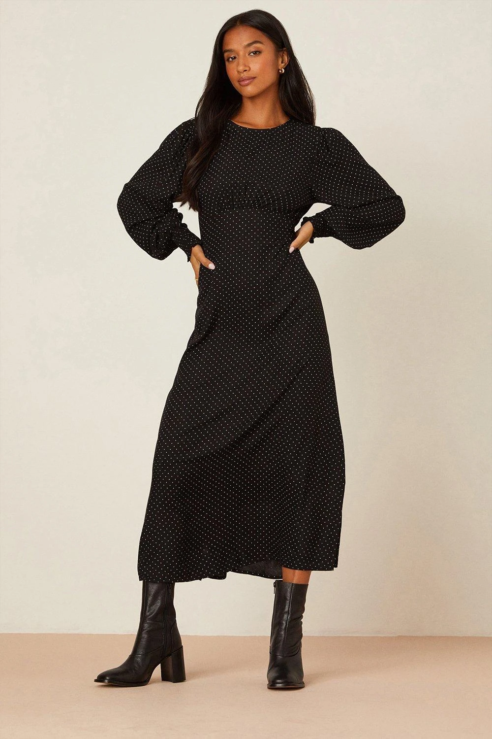 Dorothy Perkins Petite Black Spot Long Sleeve Ruched Cuff Midi Dress
