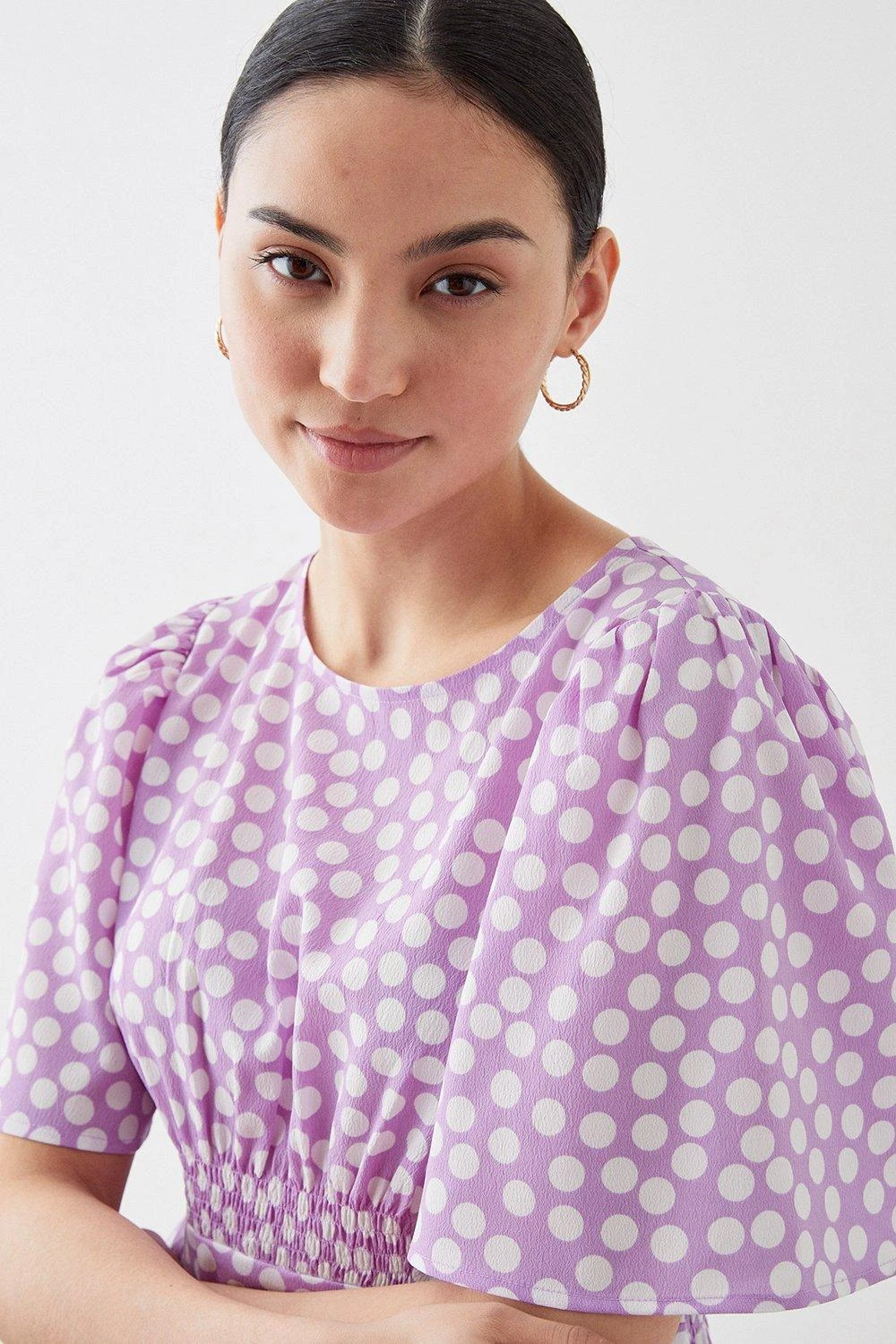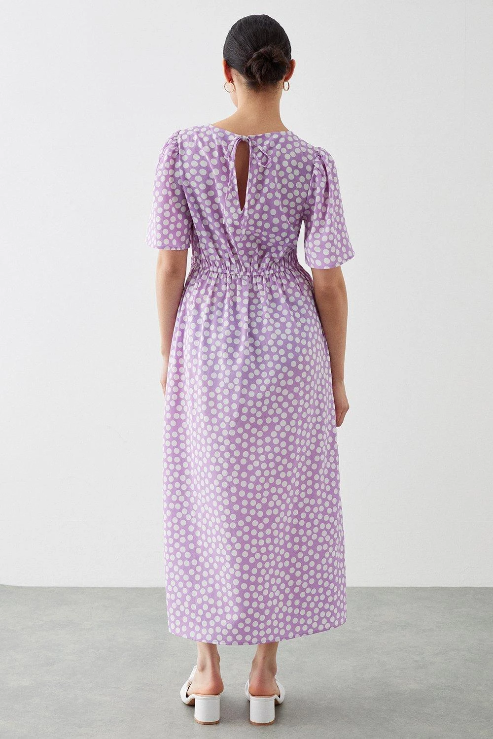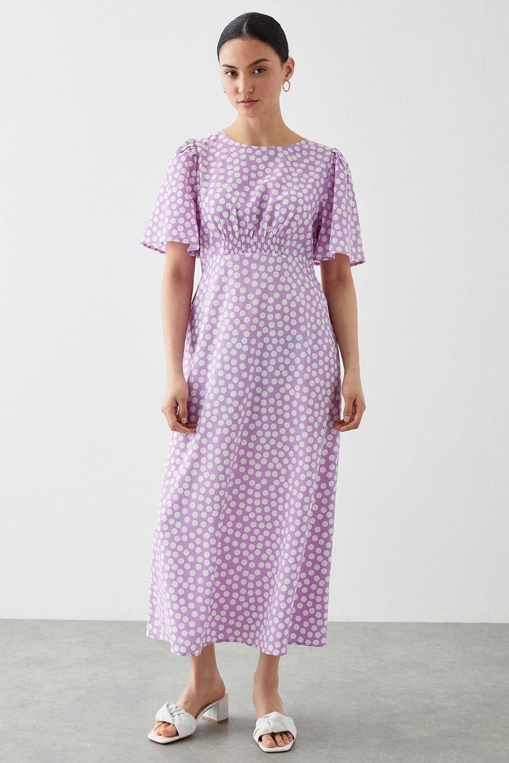 Dorothy Perkins Petite Lilac Spot Flutter Sleeve Shirred Waist Midi Dress