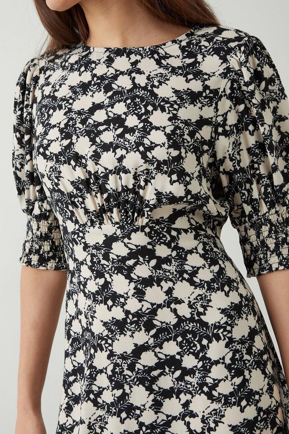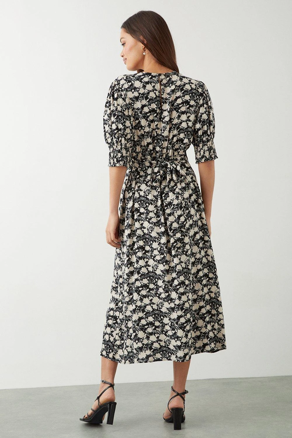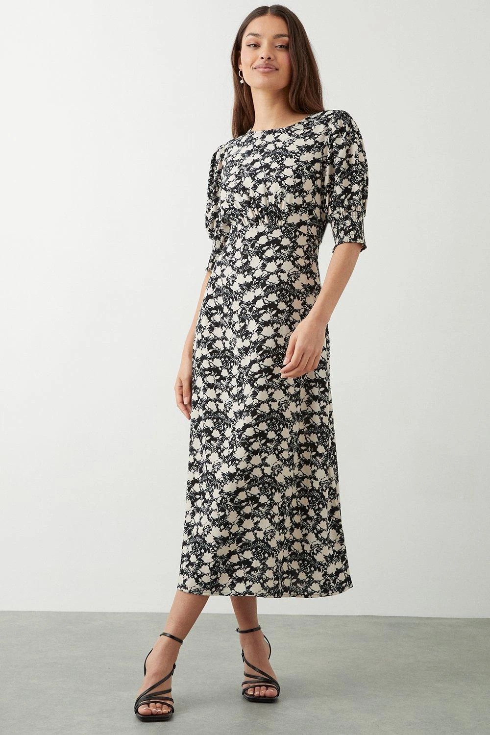 Dorothy Perkins Petite Mono Floral Shirred Cuff Midi Dress