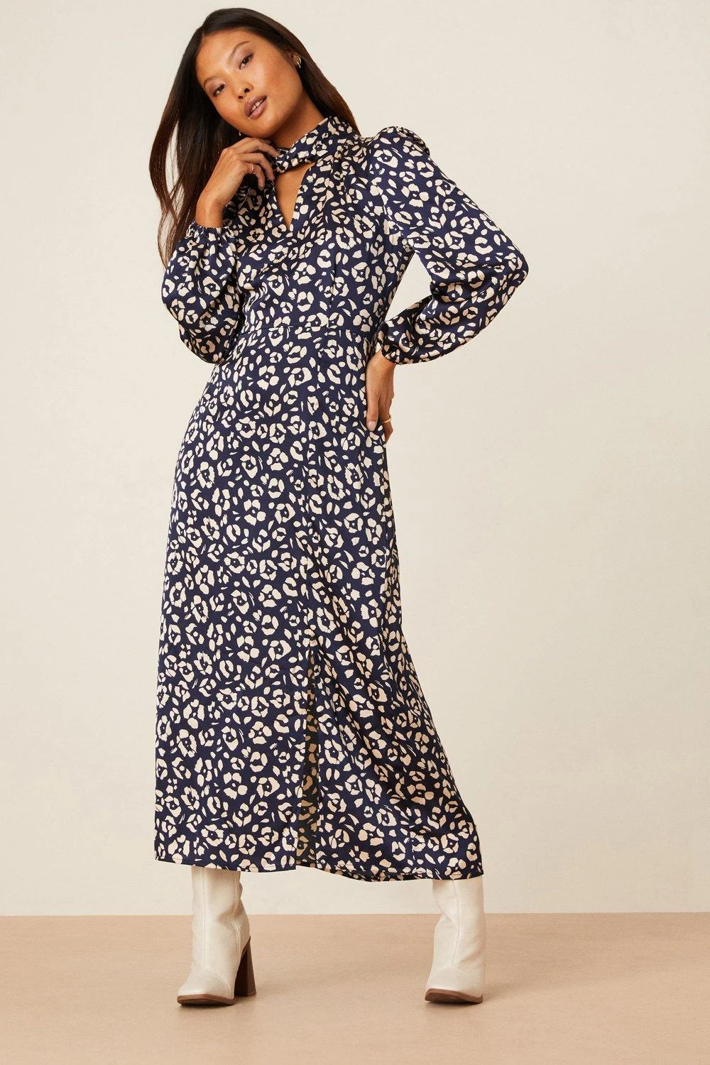 Dorothy Perkins Petite Navy Animal Twist Neck Keyhole Midi Dress