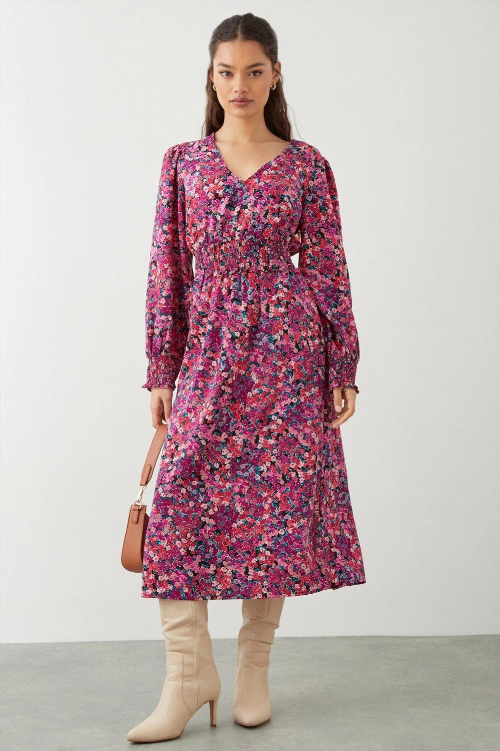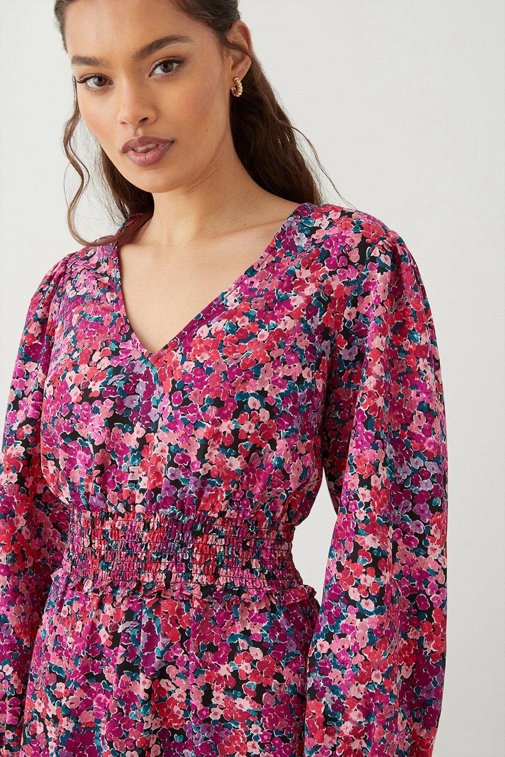 Dorothy Perkins Petite Pink Ditsy Shirred Waist Midi Dress