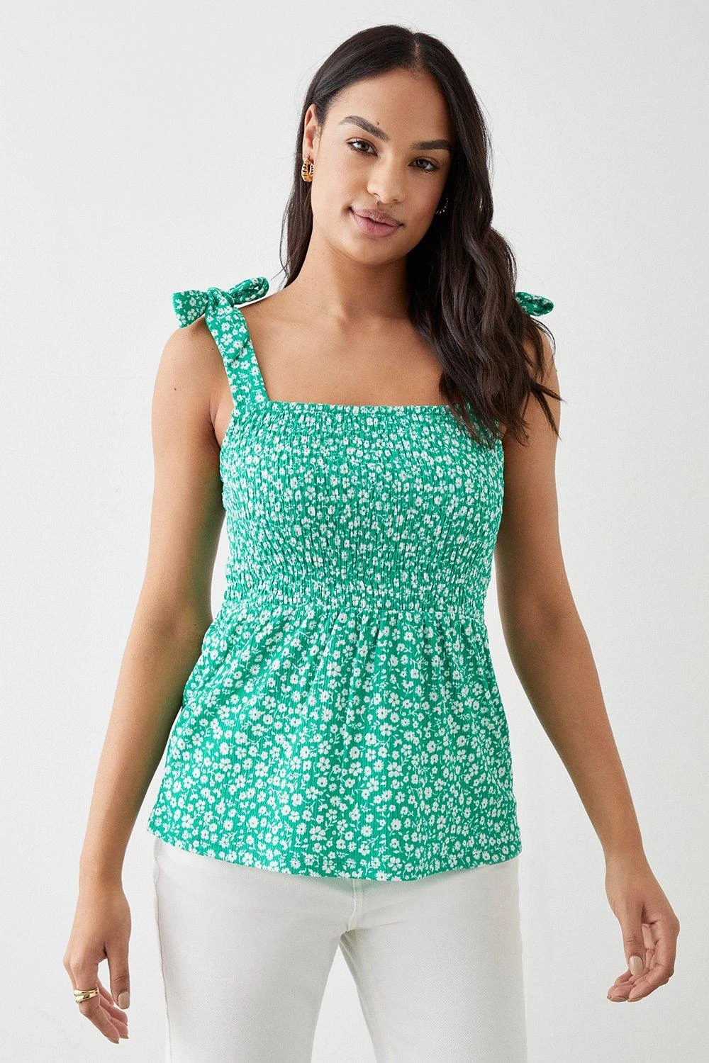 Cami or blouse? Shirt or bodysuit? Whatever you’re after, our women’s tops have you covered for every event in the social calendar. From casual fits to elevated styles for special occasions, we make it easy to nail the ‘jeans and a nice top’ look. Think puff sleeves, pretty prints, wrap silhouettes and so much more. Style: Shirred Body Tie Shoulder Vest. Ideal for: Daywear. Design: Shirred. Model wears size UK 10 and is 5′ 9″ tall. Make-up & Fragrance: Primer (Estée Lauder, The Mattifier Shine Control Perfecting Primer + Finisher), Foundation (Lancôme, Teint Miracle Luminous Satin Foundation), Mascara (Estée Lauder, Double Wear Zero-Smudge Lengthening Mascara), Blusher (Benefit, Wanderful World Blushes Starlaa Rosy Bronze Powder Blusher), Setting Spray (Benefit, Porefessional Super Setter Setting Spray Mini 30ml), Fragrance (Elie Saab, Elixir).