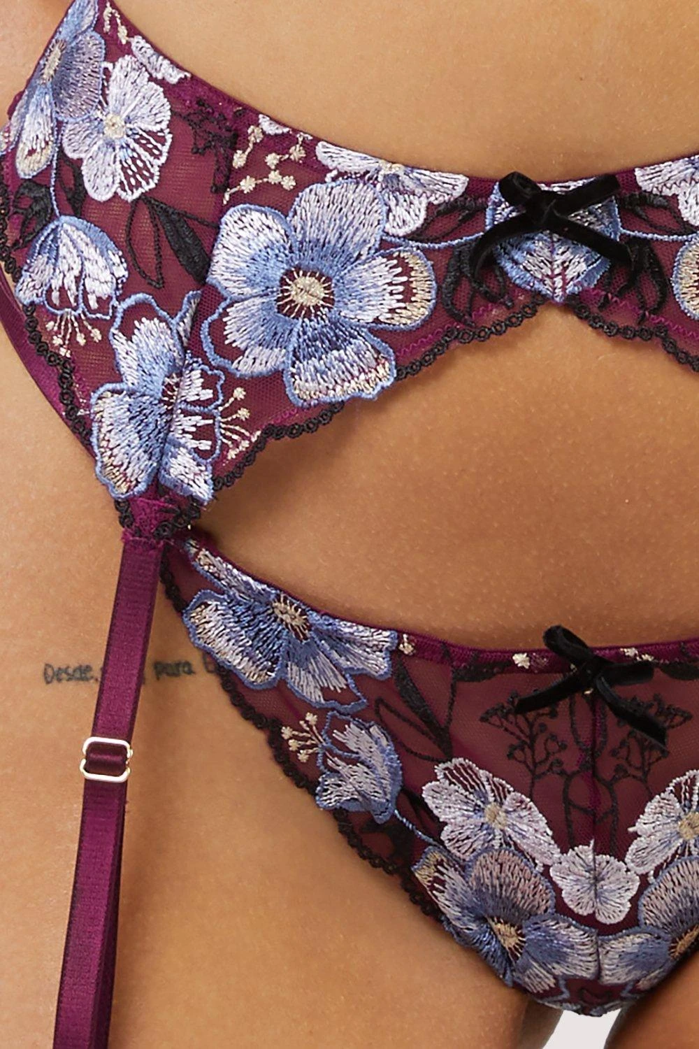 Playful Promises Joanna Burgundy Gold Embroidery Suspender Belt